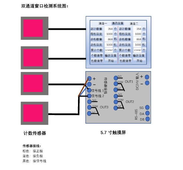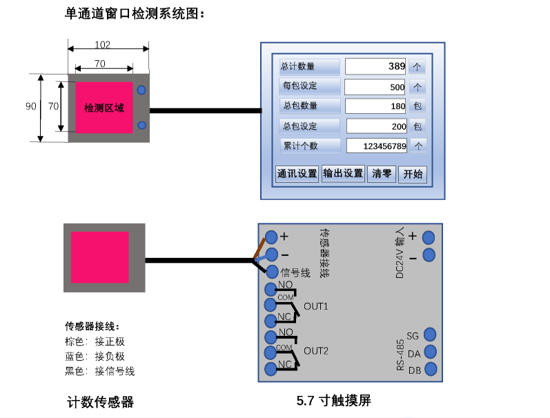 將系統(tǒng)各自安裝固定好后,按照隨貨提供的接線圖紙,對應(yīng)接線就完成安裝工作。本產(chǎn)品是根據(jù)顆粒包裝機(jī)客戶需求定制化的產(chǎn)品,安裝接線完成后只需要簡單設(shè)置就可投入運(yùn)行,區(qū)域檢測光電傳感器接線從觸摸屏一體機(jī)取電,當(dāng)觸摸屏上電后,光電傳感器的藍(lán)色燈亮。當(dāng)有物體通過傳感器檢測窗口時(shí),指示燈會變紅色。